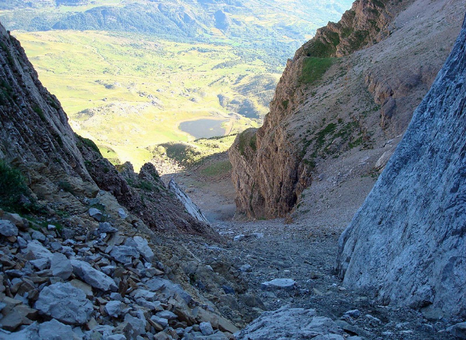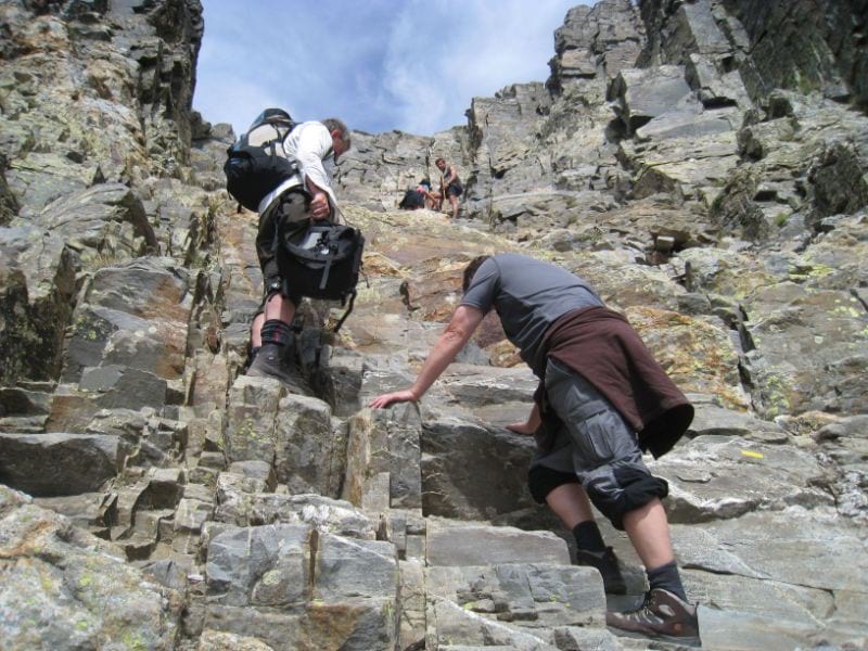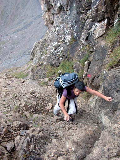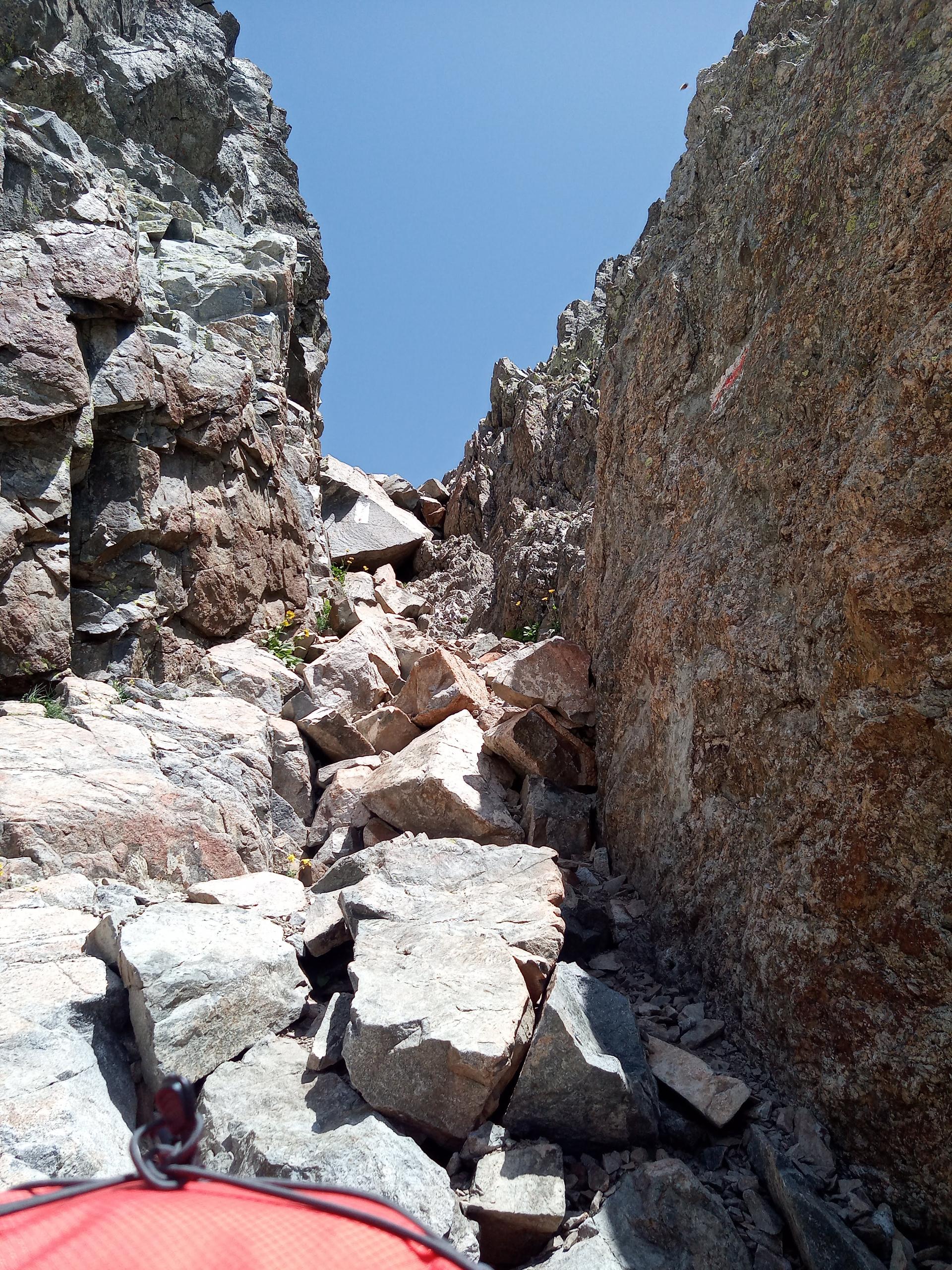 Cheminée du Pic du Canigou versant sud. Montée très raide dans des blocs (escalade niveau 2). Peut poser problème dans le sens de la descente pour un randonneur chargé.