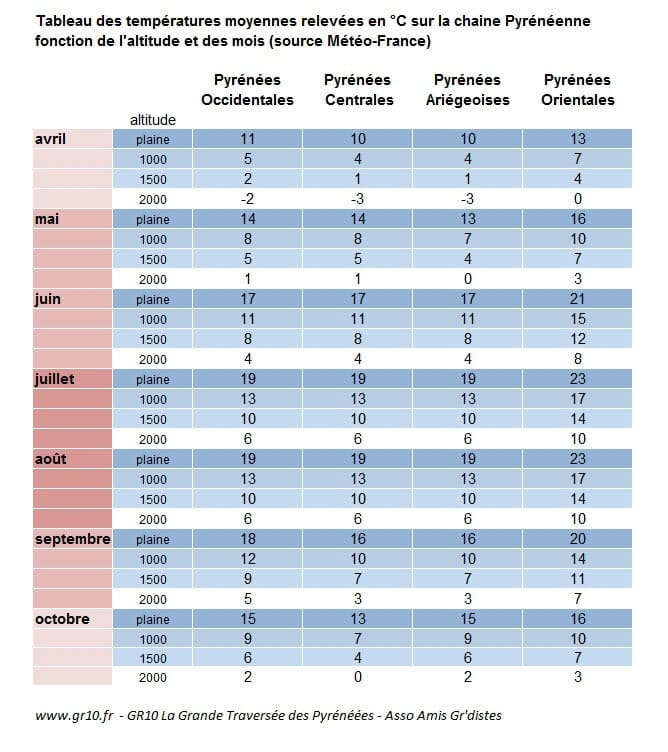 Tableau des températures moyennes relevées sur les Pyrénées :