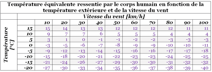Températures équivalentes ressenties en fonction de la température et et de la vitesse du vent :